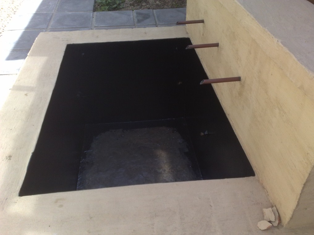 The design of the pond is simple rectangle  1.2mx1.5m  – I made it deep so the water level could fluctuate between rainy periods, about 1m. It is constructed of a 220mm 2 layer brick wall with brickforce wire reinforcing every 3rd coarse. It was then plastered and left to cure for a few weeks (mainly because I was putting off the nasty fiberglass job). Once it was nicely cured and dry, I then gave it a coat of normal resin with a second coat of black flow-coat to finish off. Those who have fiberglassed before will be saying but what about the glass matting – well I looked at the pond – there were no cracks and I didn’t have enough matting. So I decided to take a chance and only use the resin – touch wood it seems to be working and as long as it doesn’t crack it should stay that way!