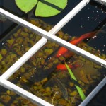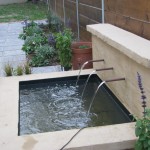 To keep the water clean I put a good 4 inch layer of stone at the bottom to act as an anaerobic zone and then planted it out with some Irises and a water Lilly. Finally a submersible pump circulates the  water through 3 nozzles in the back wall. I was amazed that with 6 fish – 2 goldfish and 4 Koi that although it did initially go murky, after about 4 weeks the water stabilized was crystal clear. It has stayed that way for 2 months now and the only maintenance is I have cleaned the sponge filter on the pump twice. I know the system is healthy as 2 frogs have produced about a million tad poles which seem quite happy as well.